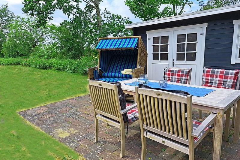 Die ruhige Lage lädt zu herrlichen Ferientagen ein. Der Terrassenplatz mit Gartenmöbeln und Strandkorb (April-Oktober) befindet sich neben dem Hauseingang auf dem vorderen Grundstück. Ein PKW-Stellplatz und Fahrradständer befinden sich am Haus.